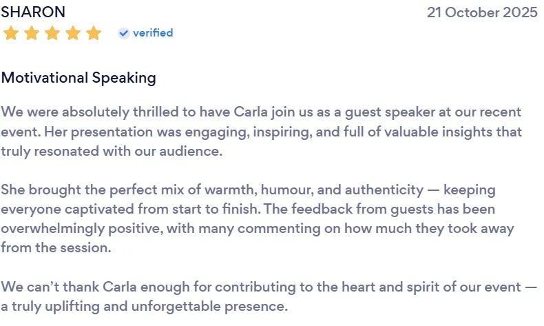 Invite Carla to illuminate your event with her expertise, insights, and engaging approach to mental health and well-being.